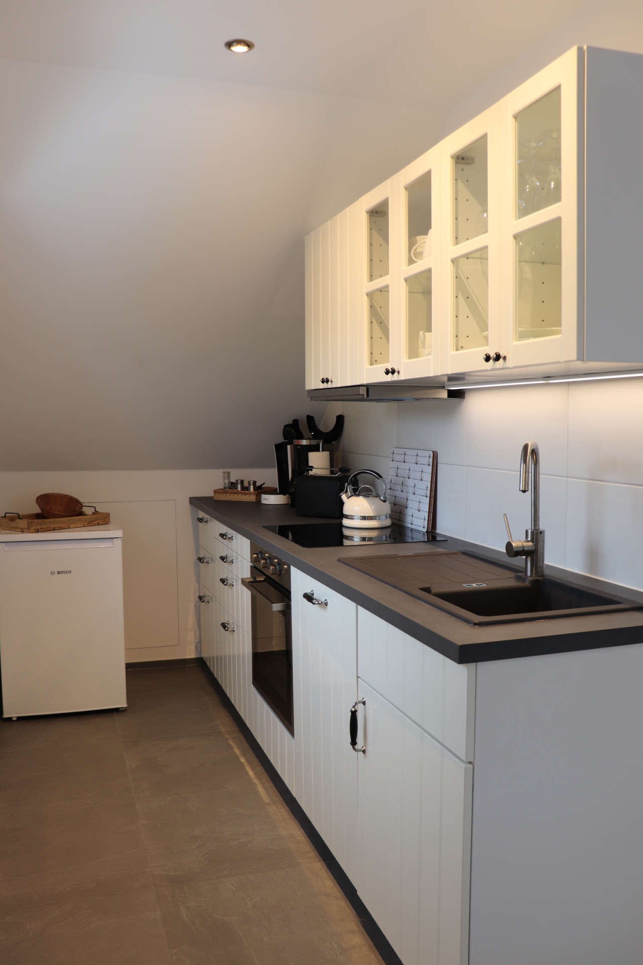 Der offene Wohn- und Essbereich lädt zum ruhigen Ausklang ein. Die voll ausgestattete Küche mit Backofen, Kühlschrank und allem, was Sie zum Kochen benötigen, grenzt direkt an den Essbereich und das Wohnzimmer an. Hier können Sie sich kulinarisch verwöhnen.